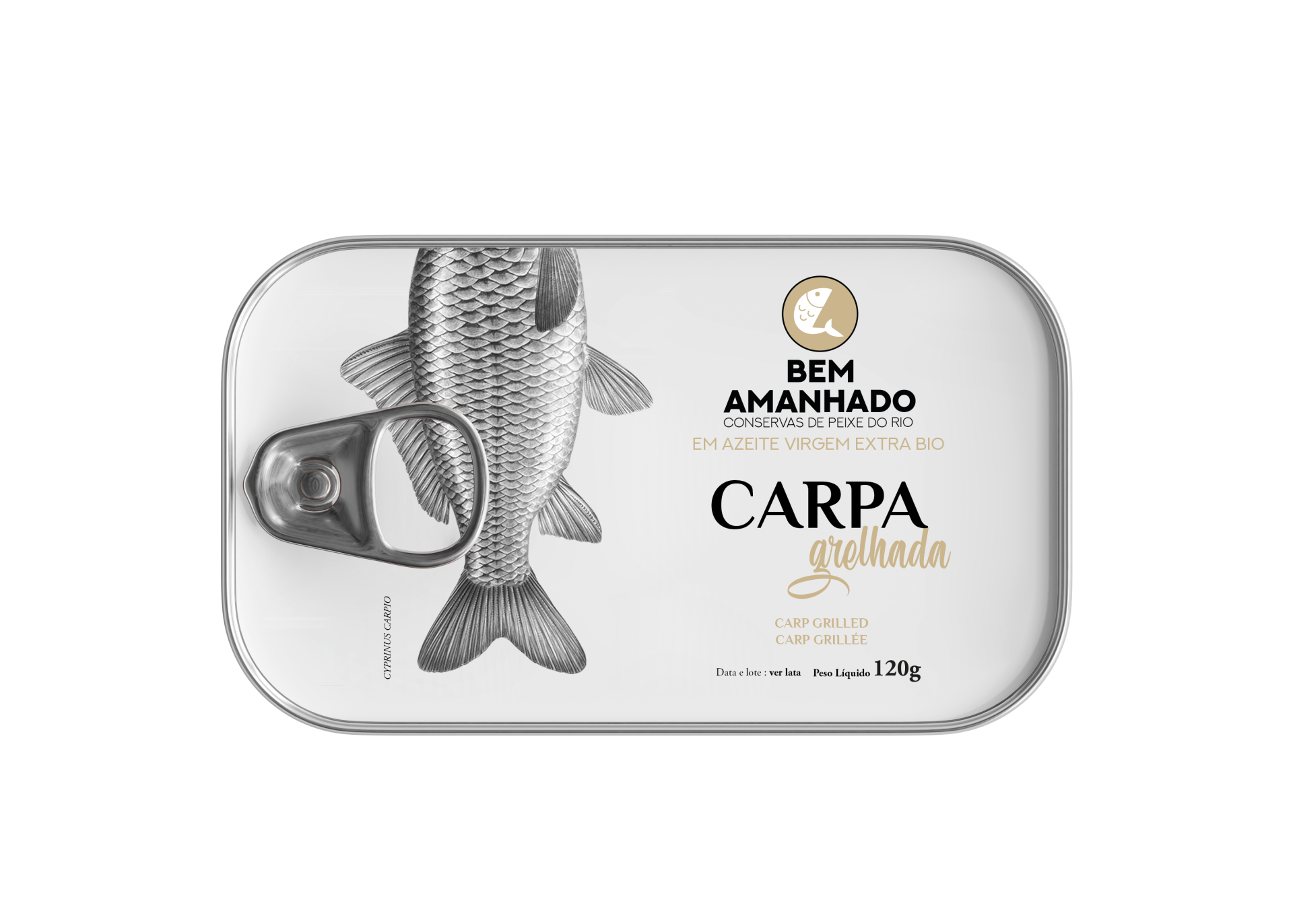 Carpa (65%); azeite virgem extra; alho; coentro e sal. (Certificado por PT-BIO-02). Alérgenos: contém peixe e sulfitos. Pode conter espinhas. Peixe de origem UE. Carp (65%); extra virgin olive oil; garlic; coriander and salt. (Certified by PT-BIO-02). Allergens: contains fish. May contain bones. Fish of UE origin. Carp (65%); huile d' olive extra vierge; ail; coriandre et sel. (Certifié par PT-BIO-O2). Allergènes: contient du poisson. Peut contenir des arêtes. Poisson d'origine UE. Declaração nutricional média por 100g (produto escorrido) / Nutritional information typical value per 100g (drained) / Valeur nutritionnel moyenne pour 100g (égoutté): Energia: 1774 kj / 429 kcal; Lípidos: 39g; Dos quais saturados: 7,8g; Hidratos de Carbono: 4,9g; Dos quais: Açúcares: 0g; Fibras Alimentares: 0g; Proteínas: 14g; Sal: 0,5g. Conservar em local seco e fresco. Após abertura, manter refrigerado e consumir no prazo de 4 dias.